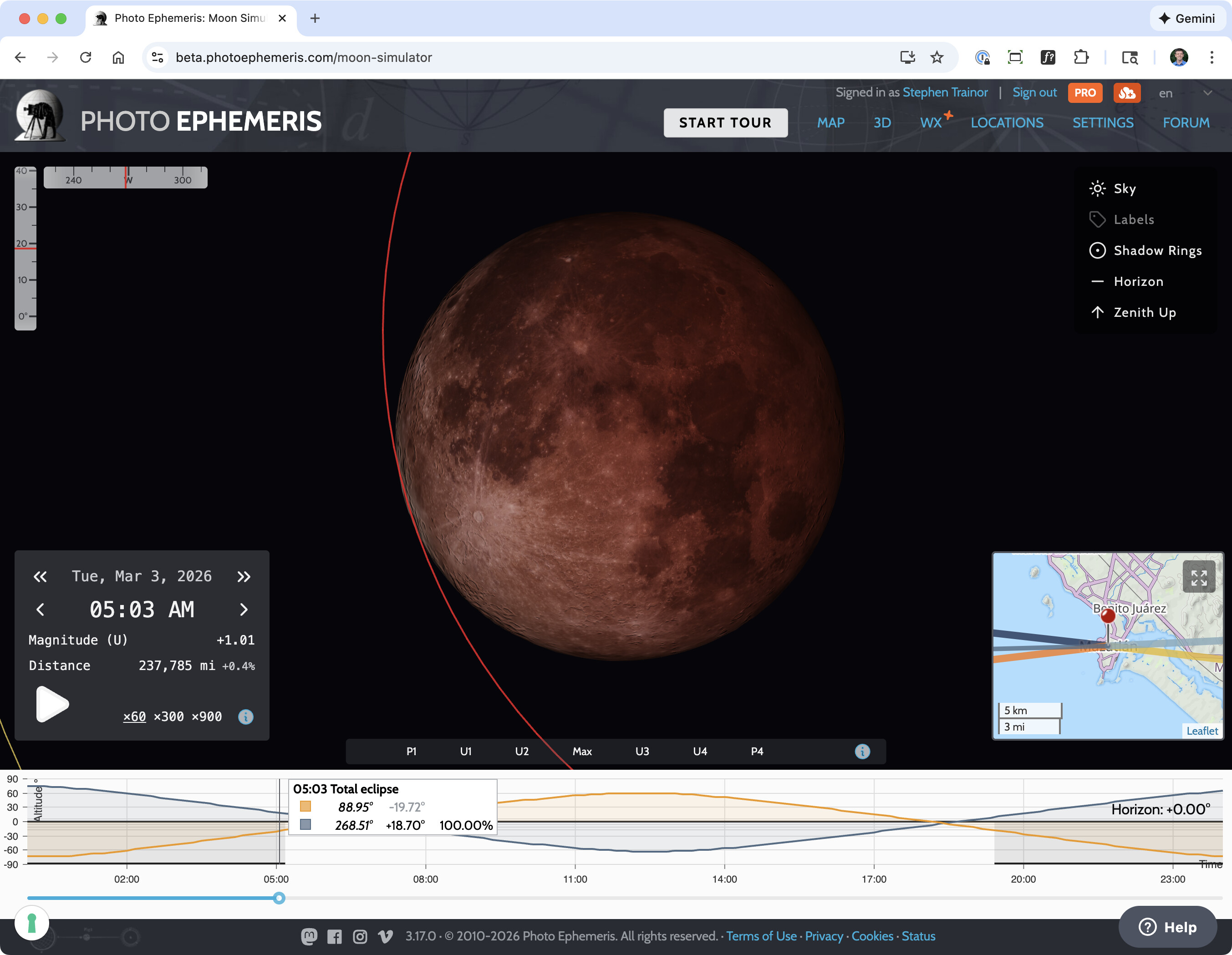Display options toolbar (sky gradient, labels, shadow rings, horizon)