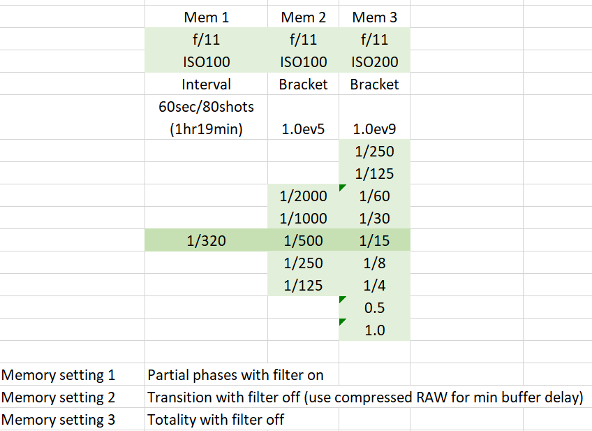 Yes, Stephen, the memory registers are life savers especially as cameras get more complex and I get older. Sony only makes 3 available in camera memory. To use more you have to store them to the SD card. Just not practical. I feel pretty confident about the settings and sequence. 1-2-3-2-1 done. But always open to suggestions from folks that have done more eclipses than I have.